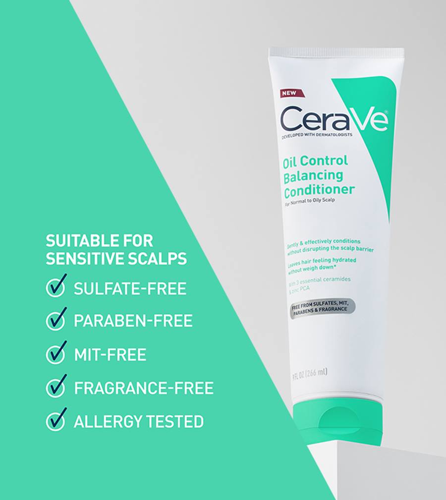 Our oilyhaircare routine includes both a shampoo and aconditioner designed for oily hair. Developed with dermatologists, this conditioner for greasy hair has three essential ceramides, zinc PCA, niacinamide, and hyaluronic acid??and no sulfates, dyes, parabens, fragrance, or MIT. When used with our Oil Control Balancing Shampoo, it helps remove excess oil and purify the scalp??leaving your hair feeling cleaner, softer, and healthier-looking without weighing it down. Non-comedogenic, pH-balanced, and allergy-tested, it??s suitable for all hair types, even sensitive scalps and curly or color-treated hair, on anyone aged 13+.